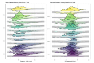 Historical size frequency for snow crab (Chionoecetes opilio) in the eastern Bering Sea (Zacher et al., 2025).